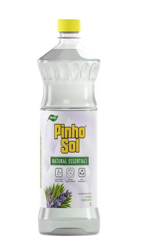 Desinfetante Pinho Sol Naturals Lavanda e Melaleuca 1L A marca de desinfetante que você já conhece e confia traz mais uma solução para cuidar da sua casa e do planeta. Pinho Sol Natural Essentials é um desinfetante com ativos biodegradáveis e fragrância com extratos naturais em sua fórmula, além de embalagem 100% recivável, tudo isso sem deixar de eliminar até 99,9% dos germes e bactérias.