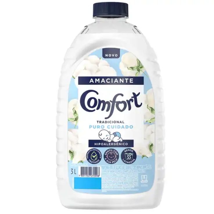 Fórmula hipoalergênica e dermatologicamente testada. Gentil com a pele, perfume delicado, toque suave e macio, peças mais fáceis de passar e mais perfumadas. Rende 20 lavagens O Amaciante Diluído Comfort Tradicional Puro Cuidado foi desenvolvido com fórmula extra suave, é seguro para as roupas do seu bebê e também para as roupas de pessoas com peles sensíveis. Sua fórmula é hipoalergênica e dermatologicamente testada. O Amaciante Diluído Comfort Tradicional Puro cuidado tem a fragrância suave que você já conhece, pensada para não irritar a pele delicada. Gentil com suas roupas e com sua pele, o Amaciante Diluído Comfort Tradicional Puro Cuidado garante maciez para as roupas de toda a família, inclusive as roupinhas dos bebês, deixando-as mais leves e confortáveis de usar. Com o toque suave, o amaciante de roupas Comfort Tradicional Diluído Puro Cuidado deixa as suas peças mais fáceis de passar e suavemente perfumadas. O Amaciante Diluído Comfort Tradicional Puro Cuidado cuida das roupas com carinho, deixando as peças com perfume delicado e toque macio. Usar o amaciante Comfort na hora de lavar suas roupas é muito simples: consulte a quantidade recomendada na embalagem e, dosando o amaciante conforme indicado, despeje a quantidade de produto dentro do compartimento de sua máquina de lavar. Em seguida, escolha o ciclo de lavagem desejado. Se preferir, o Amaciante Diluído Comfort Tradicional Puro Cuidado também pode ser usado na lavagem das suas roupas no tanque.