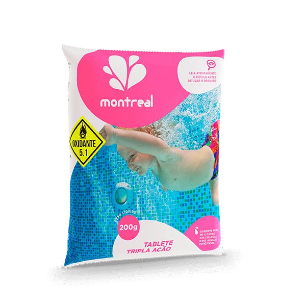 O Montreal Tablete Tripla Ação é um agente saneante para piscinas que reúne em um só produto a excelente ação do Tricloro somado a um algistático que inibe o desenvolvimento das algas e ainda um decantador que auxilia na limpeza da água.