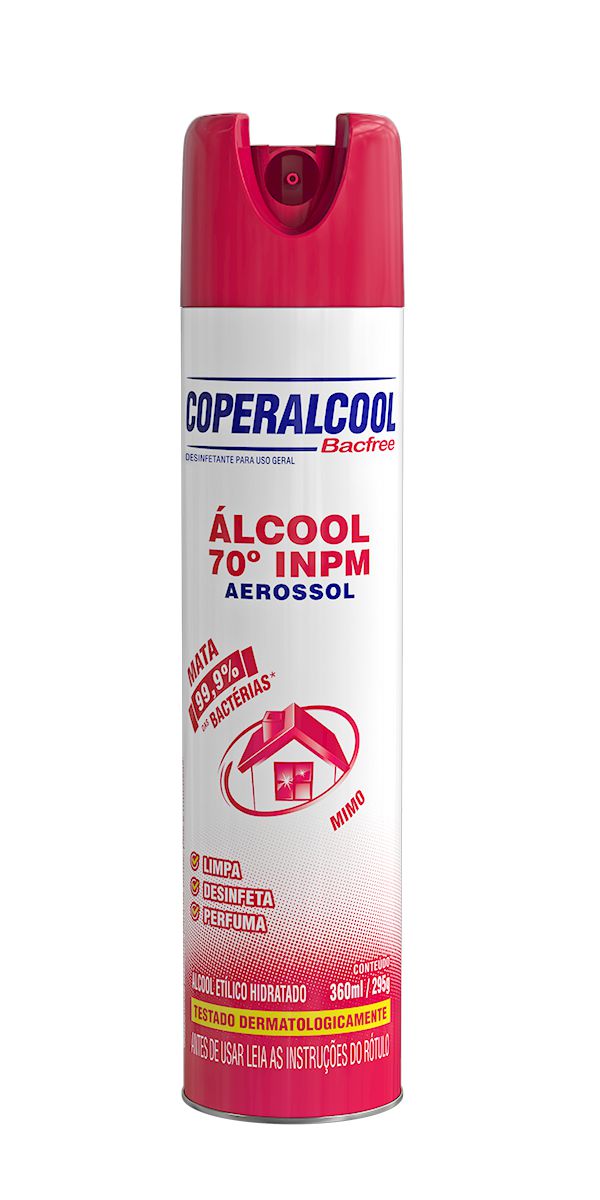 Mais uma opção prática e segura, COPERALCOOL BACFREE 70° INPM AEROSSOL é um aliado eficiente para limpar, desinfetar e proteger todos os ambientes, dispensando o uso de água e colaborando com o meio ambiente.